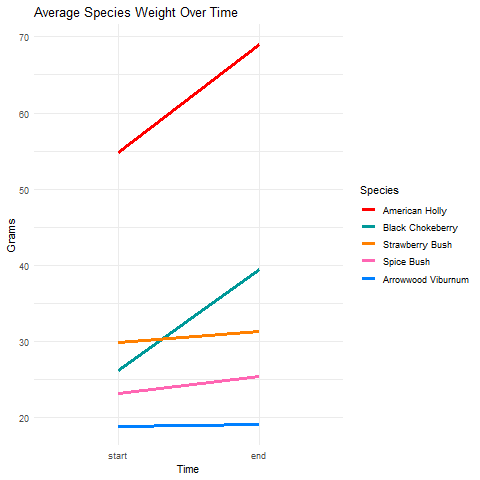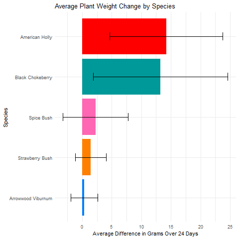 On average the American Holly sequestered the most carbon, but the individual plant that gained the most weight was a Black Chokeberry. Not all plants gained weight due to leaves falling and certain plants entering their winter stage, but on average every species gained weight. Some species gained less weight because they had more intense winter stages or because the species processes carbon slower. By looking at the data, I can say that the shrubs are important to carbon sequestration. The trees (American Hollies) did absorb more carbon than the shrubs, but Black Chokeberry was very close behind.