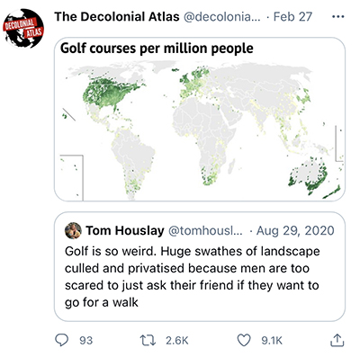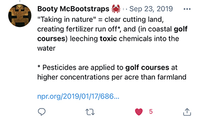 Golf courses are the same as any other environmental problem, but they are not as obvious until you learn all about the toxic chemicals necessary to keep them looking pristine. And people should not have to be poisoned, get cancer, and die just because looks can be (and are) deceiving. You shouldn’t have to die for a cliche to be true.