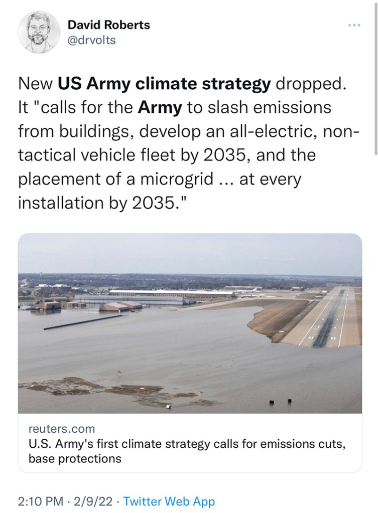 The formidable US Army, with its massive buying power, arrived on the climate action battlefield this week, armed with its Army Climate Strategy (ACS) and ready for rapid execution. The ACS acknowledges that climate change has destabilized the world, and that the army must move swiftly to stay out in front of our adversaries who are intent on jockeying for an advantage in a climate-altered world.