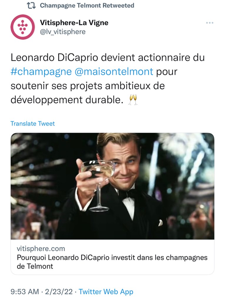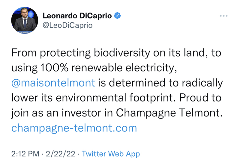 Leonardo DiCaprio announced on Twitter that he was proud to be a new investor in Champagne Telmont. Telmont’s commitment to biodiversity on its land, use of 100% renewable energy, and determination to “radically lower its environmental footprint” were key factors in DiCaprio’s decision to join the 100 year old Champagne House.