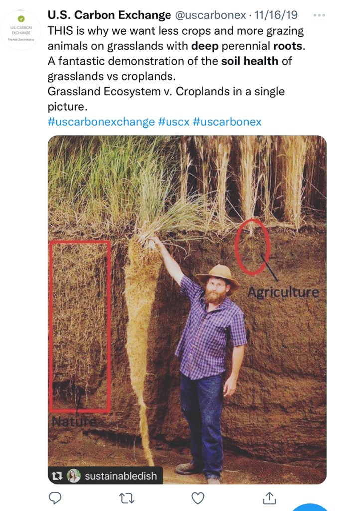 These legumes and grasses store carbon above ground in the plant itself, but mostly in the roots which carry the carbon into the soil where it’s deposited and permanently sequestered unless disrupted by carbon-escaping activities such as development, plowing, etc.