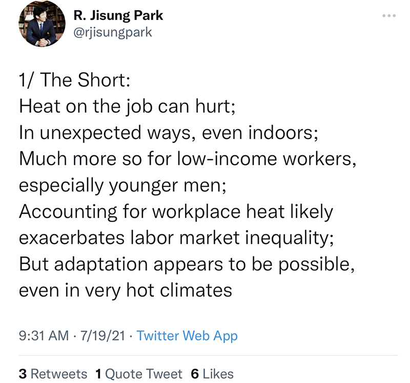 - Work Performance. According to UCLA Assistant Professor for Public Policy Dr. Jisung Park, “heat hurts.” “Using data culled from the universe of injuries connected to the nations largest worker’s compensation claims,” Park and colleagues explored the link between heat and workplace safety and determined that injuries are more likely when temperatures are above a heat index of 90ºF.