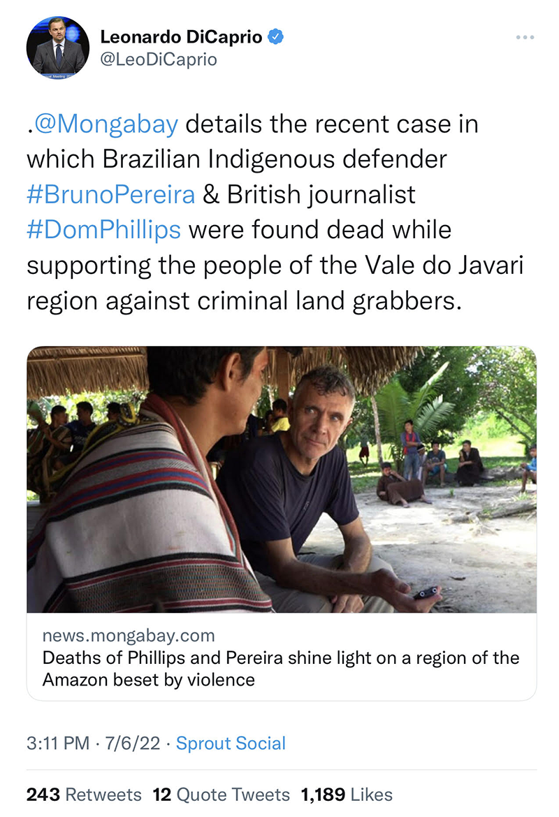 DiCaprio: .@Mongabay details the recent case in which Brazilian Indigenous defender #BrunoPereira & British journalist #DomPhillips were found dead while supporting the people of the Vale do Javari region against criminal land grabbers.