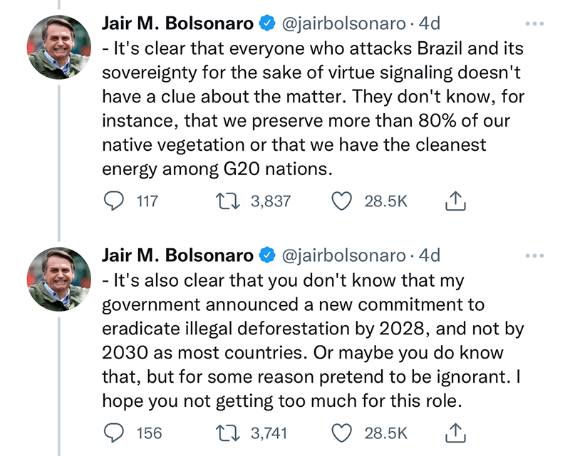 – It’s also clear that you don’t know that my government announced a new commitment to eradicate illegal deforestation by 2028, and not by 2030 as most countries. Or maybe you do know that, but for some reason pretend to be ignorant. I hope you not getting too much for this role.