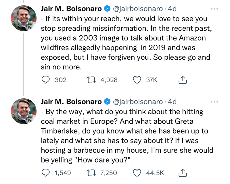 Is Greta Timberlake an autocorrect error, or does Bolsonaro not even know that Greta’s last name is Thunberg?