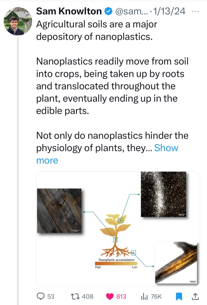 As if these shocking facts aren’t alarming enough to make us stop in our tracks and change our habits, Agronomy consultant Sam D. Knowlton alerted the public on X in January 2024 that “Nanoplastics readily move from soil into crops, being taken up by roots and translocated throughout the plant, eventually ending up in the edible parts.”