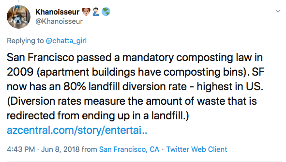 San Francisco began requiring mandatory composting back in 2009. And according to AZCentral, at the beginning of 2018, San Francisco had a landfill diversion rate of 80 percent, the highest in the country, with the goal of hitting 100 percent diversion rate by 2020. This is a sharp difference from Arizona’s 20 percent landfill diversion rate in 2018, and goal of 40 percent by 2020.